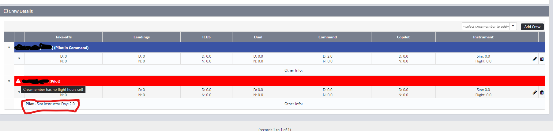 There are instances where the instructor is neither the Pilot in Command nor Co-pilot in the simulator. In an event like this, the instructor has to fill his/ her duty section without any PIC or Co-pilot hours. This will let into a warning message in his duty section saying 'Crewmember has o flight hours set'.