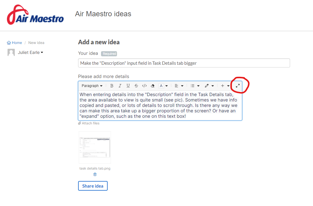 When entering details into the "Description" field in the Task Details tab, the area available to view is quite small (see pic). Sometimes we have info copied and pasted, or lots of details to scroll through. Is there any way we can make this area take up a bigger proportion of the screen? Or have an "expand" option, such as the one on this text box (pic2)!