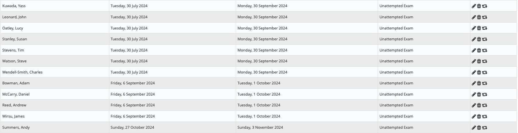 Can we please have the ability to do bulk re-enrolling for exams so we don't have to individually got to each person. A check box on the left hand side would be great. See attached image. Also if the exam close date default can be 4 weeks not 1.