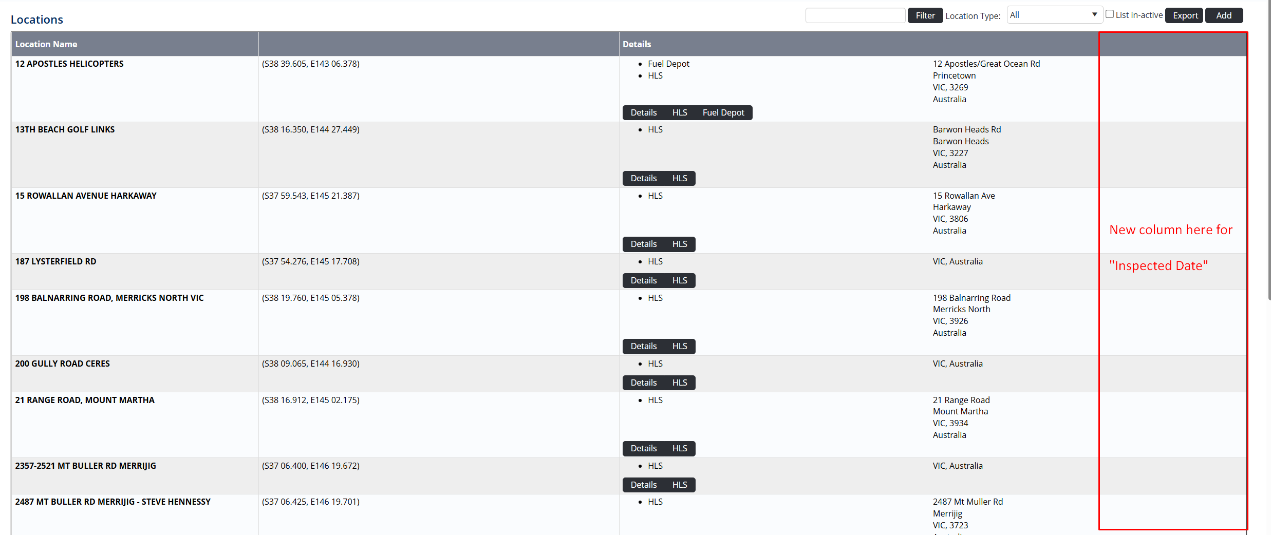 On our locations register could we please add a 5th column on the right-hand side of the page which will have the title of inspected date at the top and date of inspection next to each row. xx/xx/xxxx